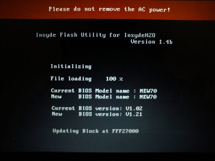 Komutu ilk defa çalıştırdığınız bilgisayarınız kendi kendini kapatabilir. Bu gayet normaldir. Sistemi yeniden açılırken yine F12 tuşuyla Boot menüsünden flash belleğinizi seçin ve komutu yeniden girin. BIOS güncelleme işlemi bu defa başlayacaktır. Insyde Flash Utility for InsydeH2O 1.4b adlı yazılım ana BIOS’u güncelleyecektir.