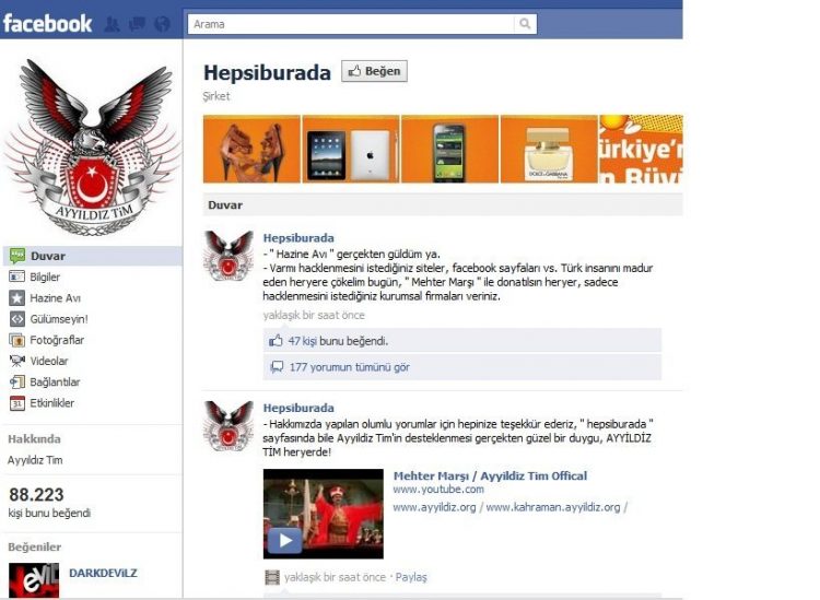 Bugün Hepsiburada.com’un Facebook sayfasını beğenen kullanıcılar ilginç bir logoyla karşılaştı. Dikkatli baktıklarında ise bunun Türk hack grubu Ay Yıldız Tim tarafından ele geçirilmiş olduğu anladılar. Bu yerli grup hazine avı etkinliğini yarıda kestiğinde pek çok kullanıcı durumu kavrayamayarak, “Hazine avına ne oldu?” sorusunu sordular.