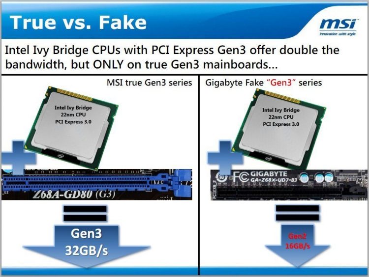 MSI, Gigabyte’ın Ağustos ayında yaptığı bir açıklama üzerine düşündü, taşındı, araştırdı ve bir slayt gösterisi hazırlayarak dev firmaya yalancı dedi. Gigabyte yaptığı açıklamada yeni anakartlarının Native PCIe Gen. 3 destekli olduğunu duyurmuştu. Bu en son teknoloji normalde 16 GB/s olan bant genişliğini 32 GB/s’ye çıkartan büyük bir gelişmeydi. Ancak MSI kendi anakartlarında bulunan teknolojinin gerçek, Gigabyte anakartlarında bulunan teknolojinin ise yeni nesil makyajı yapılmış eski nesil teknoloji olduğunu iddia ediyor. İşte yayınlanan bu slayt gösterisi de iki firmanın ürünleri arasındaki farkı gösteriyor.
