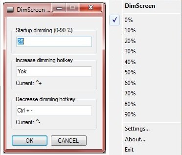 DimScreen, Laptop kullanıcıları için özel olarak tasarlanmış tamamen ücretsiz ve kuruluma gerek duyulmayan ufak bir yazılım. DimScreen, sayesinde ekranın parlıklık ayarlarını istediğiniz gibi ayarlayabilme şansına kavuşuyorsunuz. Geceleri Laptoptan ya da Tablet PClerden okunan metinler, kitaplar ya da çizgi romanlar bir süre sonra can sıkıcı olmaya başlayabiliyor. Karanlık odanın içerisinde suratınıza parlayan bembeyaz parlak ışık insan gözünü yorabiliyor.