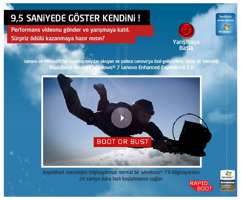 Bunun için Facebook üzerinden “9.5 saniyede Göster Kendini” adlı bir yarışma da başlatan Lenovo, “Rapidboot” teknoloji ile zamana meydan okurken, kullanıcıları da bu heyecana davet ediyor. Yarışmaya katılmak için kullanıcıların Lenovo’nun Facebook sayfasındaki aplikasyonu beğenmesi ve ardından 9.5 saniye içinde gerçekleştirdikleri performansın videosunu eklemeleri yeterli.