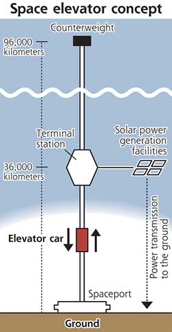 Japonya’da ki Obayashi Corparation, belki bu fikirlerden birini gerçekleştirmeyecek ama büyük bir projenin ilk adımlarını attılar. Firma’nın duyurduğu projeye göre yeryüzünden dünya yörüngesinde bulunan bir uzay istasyonuna, 96 kilometrelik bir asansör yapma başarısı gösterilebilir. Şu an için araştırma çalışmaları sürdürülmekte. Maliyet, yapım ve aracın konulacağı yer şu an için en çok kafa karıştıran sorunlar. Obayashi Şirketi 2050 yılında bu işe girişebileceğinden oldukça emin.