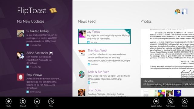 Windows 8’in Metro arayüzü için geliştirilen sosyal medya programı FlipToast sonunda çıktı! Microsoft tarafından geliştirilen Tweet@rama programını yetersiz ya da kullanışsız bulanlar için son derece uygun olan FlipToast programını kullanarak Twitter ve Facebook hesabınıza ulaşabilir, en son tweet’leri ve durum güncellemelerini görebilirsiniz. Ayrıca bu programda en son gönderilere yorum yapabilir ve “Beğen”ebilirsiniz.