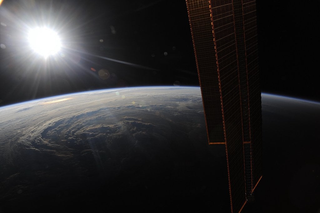Profesyonel bir fotoğrafçı edasında tüm görüntüyü kadraja sığdırmayı başarmış. Yeryüzünde gözüken spiral bulutlar, o an Pasifik Okyanusunda bulunan Earl Kasırgası. Sağ yanda bulunan parçagüneş ışınlarını çekip uyduya enerji sağlayan panel ve tabi ki tüm ışıltısıyla Güneş.