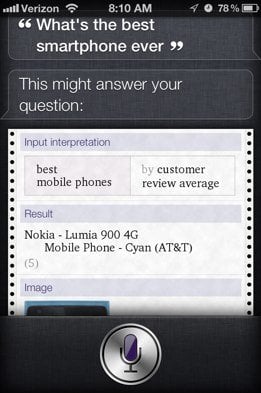 Ancak geçtiğimiz günlerde internette dolaşan bir haber oldukça dikkat çekti. Siri’ye “en iyi telefon hangisi (what’s the best smartphone ever) ? ” diye sorulduğunda cevap AT&T destekli ” Nokia Lumia 900 ” olması herkesi şaşırttı. 4S Iphone olması dışında firmadan bile olmayan farklı bir kuruluşun telefonunu göstermesi oldukça garip karşılansa da bir çokları tarafından oldukça komik bulundu. Elbette Siri’nin bir hatası yoktu. O sadece kullanıcısını memnun edecek bir cevap bulmaya çalışıyordu ve web üzerinden son zamanlarda en çok konuşulan ve en çok puanlamayı alan Nokia Lumia 900 ilk sıralarda çıkan sonuç olmuştu.