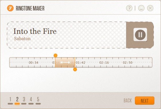 2. Adım: Şarkıyı programda açtıktan sonra çalışabilirliğini kontrol etmek için sağda bulunan “Play” butonun tıklayabilirsiniz. Çalışmayan bir şarkı üzerinde işlem yapmak iyi olmaz nihayetinde. Kontrolü yaptıktan sonra, ortadaki zaman ölçekleri sayesinde zil sesinin hangi aralıkta oluşturulacağına karar verebilirsiniz. O içi şeffaf turuncu kutuyu ileri geri yaparak halledebilirsiniz. Programın sağladığı zil sesi uzunluğu en fazla 30 saniye. Üstünde ve altında bulunan turuncu daireler sayesinde bu 30 saniyeyi kısaltabilirsiniz. Arttıramamak ne kötü. Olsun yine de iş görüyor. 1 dakikalık zil sesi bir işe yaramaz. Bunu da yaptıktan sonra yine “Next”e tıklayın.