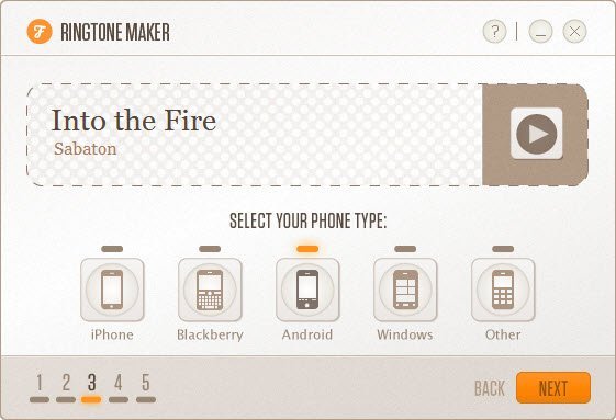 3. Adım: Bu adımda, parçayı hangi cihaza hazırladığınızı seçmeniz gerekiyor. Burası çok önemlidir. Çünkü, Android cihazı seçerseniz, o melodi sadece Android’de çalışacak demektir. Kendinizi kaybedip, “Android’i seçsem bile benim iPhone’um bunu çalıştırır.” demeyin, çalıştırmıyor. “Other”ı seçerseniz, programda bulunan iPhone, Blackberry, Android ve Windows Phone dışında kalan cep telefonları için zil sesi oluşturacaktır program. Benim telefonum Android cihaz olduğundan, Android’i seçtim. Buradaki seçiminizi kendi telefonunuza göre yaptıktan sonra tekrar “Next”e tıklayın.
