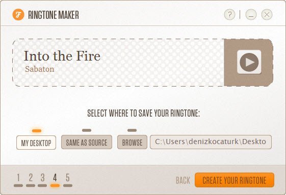 4. Adım: Sıra geldi, oluşturulacak olan melodiyi nereye kaydedeceğinizi seçmeye. Burada istediğiniz yeri seçmekte özgürsünüz. Ne de olsa sizin bilgisayarınız. Ben yine de formata uyup, bunları kısaca açıklayacağım. “My Desktop”ı seçtiğinizde, oluşturacağınız zil sesi direkt masaüstüne kaydedecek.. “Same as Source”u seçtiğinizde zil sesi bu sefer, şarkıyı hangi klasörden aldıysanız, zil sesini şarkıyı aldığınız klasöre kaydedecektir. “Browse” da zil sesini bilgisayarınızda istediğiniz yere kaydetmeniz için eklenmiş. Bu seçimlerden herhangi birini yaptığınız zaman, “Create Your Ringtone”a tıklayın ve zil sesiniz oluşturulmaya başlansın.