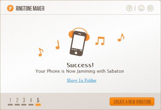 5. Adım: Kısa bir süre bekledikten sonra, zil sesiniz oluşturulmuş olacak. Kaydettiğiniz yeri bulamıyorsanız da, “Show In Folder”a tıklayarak, sesin kaydedildiği yeri açabilirsiniz. Zil sesi oluşturmaya devam etmek istiyorsanız, “Create a New Ringtone”a tıklamanız yeterli olacaktır.