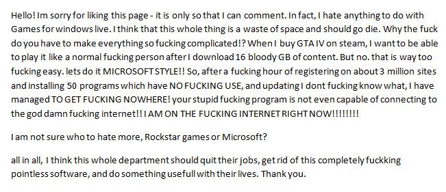 Özetleyecek olursak Microsoft bir kez daha kullanıcı deneyimini zehir etmeyi başarıyor. Sizi bir oyuncunun konuyla ilgili isyanını Games for Windows Live Facebook sayfasında dile getirdiği bu görsel ile başbaşa bırakıyoruz: