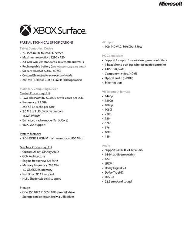 Xbox Surface bir tablet. (En azından sızdırılan belgelerde böyle geçiyor.) 7.0″ multi-touch LED ekrana sahip olacağı söylenen bu tablet son derece güçlü gözüküyor. Tabletin 1280×720 çözünürlüğe, 4 adet USB 3.0 destekli USB portuna ve 5 GB DDR3 RAM’e sahip olacağı iddia ediliyor.