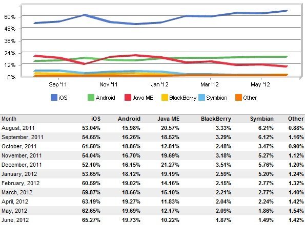 Net Applications adlı bir şirketin yaptığı araştırmaya göre Apple’ın iOS’i, pazarın yaklaşık %65’lik kesimine tek başına hükmediyor. iOS’i, %20 ile Android ve %10 ile Java izliyor. Son yılların gittikçe popülerliğini kaybeden işletim sistemleri olan Blackberry ve Symbian ise sırasıyla %1.87 ve %1.49’luk pazar payına sahip. Windows Phone’un da içinde bulunduğu diğer işletim sistemleriyse %1.42’lik pazar payına sahip.