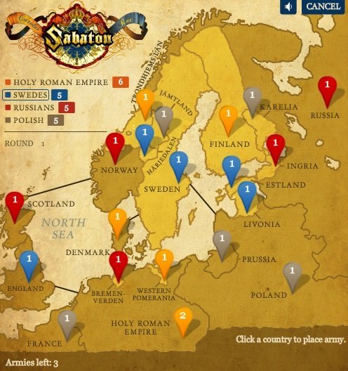 Risk benzeri bir oyun olan Swedish Empire Oyununda seçilebilen 4 ülke var; İsveç, Kutsal Roma Cermen İmparatorluğu, Polonya ve Rusya. Bu ülkelerden birini seçerek, oyuna başlıyorsunuz. Karşınıza ünlü İsveç Kralı Carolus Rex, yani XII. Karl(Demirbaş Şarl)dönemine ait bir harita çıkıyor. Bu harita üzerinde Risk mantığıyla ilerleyerek, sahip olduğunuz topraklarınızdaki birliklerin sayısını size verilen sayı doğrultusunda(haritanın sol altında Army Left yazısında ne kadar yazıyorsa) arttırıyorsunuz. Haritada sahip olduğunuz toıpraklara tıklayarak bu birlikleri çoğaltabilirsiniz.
