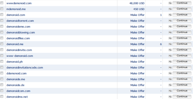Demonoid.com, Demonoid.ph, Demonoid.me alan adlarının yanında içerisinde demonoid olan pek çok farklı isim fiyat tekliflerine açık bir şekilde listelendi. www.demonoid.com 48.000 dolarlık fiyatıyla dikkat çekiyor. Bu alan adı internet üzerinde oldukça tanınmış ve popüler olsa da yeni sahiplerinin de torrent tracker olarak hizmet verme ihtimali düşük görünüyor.