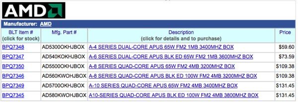 Ne var ki AMD’nin basına sızan fiyat listesine bakılacak olursa, yeni gelen dört çekirdekli, en üst seviye Trinity işlemcileri bu fiyatlara edinmek mümkün olabilecek gibi görünüyor! Yukarıda resmini de gördüğünüz fiyat listesi, yabancı bir perakende firması olan BLT’den basına sızdı. Buradan da görebileceğiniz üzere, AMD’nin en üst seviye dört çekirdekli Trinity işlemcilerini 130 dolara almak mümkün olabilecek, tabii eğer bu liste gerçekse.