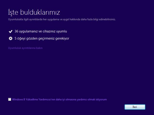 Satın alma butonuna tıkladığınızda 5MB büyüklüğünde bir Windows 8 Yükseltme Yardımcısı indiriliyor. Bu program bilgisayarınızın yeni sisteme, ne kadar hazır olduğunu ortaya çıkarıyor. Hangi yüklü programların çalışacağını hangilerinin çalışmayacağını gösteriyor. Buna göre önceden hazırlık yapmanıza imkan tanıyor. Denetleme tamamlandıktan sonra Yükseltme Yardımcısı, uyumlu ve uyumsuz programları listeliyor. Yeni sisteme uygun hangi programların gerektiğine dair bir liste çıkarıyor.