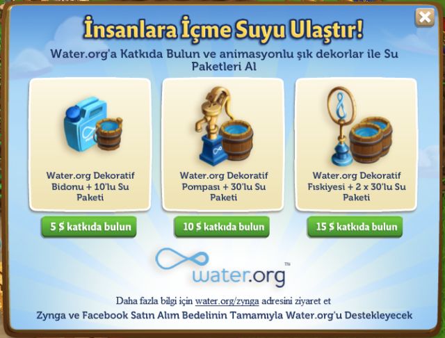 Oyuncuların sanal bir ortamda çiftçilik yaptığı Farmville 2, kullanıcılarına yeni bir teklifte bulunuyor. Gary White ve ABDli oyuncu Matt Damon tarafından kurulan Water.org, halk tarafından desteklenen, pazar tabanlı araştırma ve çalışmalar yapan bir kuruluş. Bu kuruluş dünyanın bir çok yerinde kurak alanlarda susuzlukla mücadele eden insanlara temiz su ve sağlık yardımlarında bulunuyor.