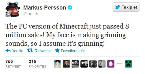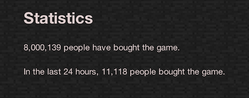 8 Milyonluk satış rakamı sadece PC ve Mac için geçerli. Xbox 360 için çıkarılan versiyonunun 4 Milyon adet sattığı belirtildi. Oyunun yapımcısı ve Mojang’ın sahibi Markus Persson oyunun başarısını bir tweet ile kutladı. Aynı şekilde Mojang’ın resmi sitesinde de benzer bir duyuru paylaşıldı.