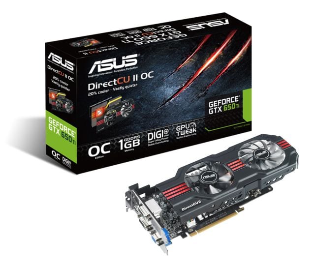 Çift fanlı ASUS GeForce® GTX 650 Ti DirectCU II ekran kartları, ev eğlencesi, grafik verimlilik ve detaylı oyun için DirectX® 11 ve 28nm seviyesine ulaşmaya meraklı olan kullanıcılara çok cazip seçenekler sunuyor. Muhteşem ASUS özellikleri, yüzde 20 daha serin ve 3 kat daha sessiz çalışma, daha uzun ömür ve daha üstün sağlamlık için DIGI+ VRM ve Süper Alaşım Gücü ile kullanıcı-dostu GPU Tweak hız aşırtma için Direct CU II termal tasarımı da içeriyor. Kartlar, NVIDIA® 3D Surround™ teknolojisiyle aynı anda dört ekranı birden de destekleyebiliyor. ASUS, TOP ve OC versiyonları dahil olmak üzere iki GeForce® GTX 650 Ti Direct CU II varyantı sunuyor.