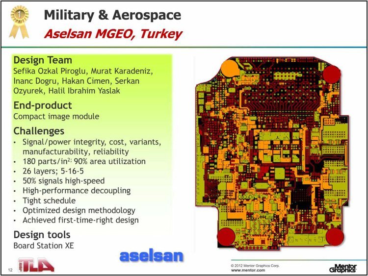 ASELSAN MGEO Grubu, “Kompakt Görüntüleme Modülü” Kartı ile ‘Mentor Graphics PCB Technology Leadership Awards (TLA) – 2012’ yarışmasının en zorlu kategorisi olarak da ifade edilen “Savunma, Havacılık ve Uzay” kategorisinde birincilik ödülünü alarak, Türkiye için bir ilki gerçekleştirdi…