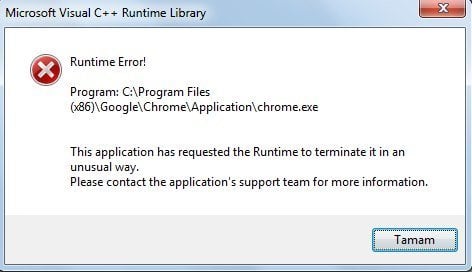Microsoft Visual C++ Runtime Library: Runtime Error: Program (kurulu olduğu adres) chrome.exe: This application has requested the Runtime to terminate it in an unusual way. Please contact the application’s support team for more information.