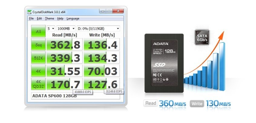ADATA’nın Premier Pro serisi SSD modeli olan SP600, SATA III 6GB/s tekniğine sahip. Bu nedenle okuma ve yazma hızı yüksek olan ürün, saniyede 360MB okuma, 130MB yazma hızına ulaşıyor. SATA II tekniğine oranla hızı bir hayli yüksek olan SP600 bu nedenle tüketiciler için hızlı bir depolama çözümü oluşturuyor.