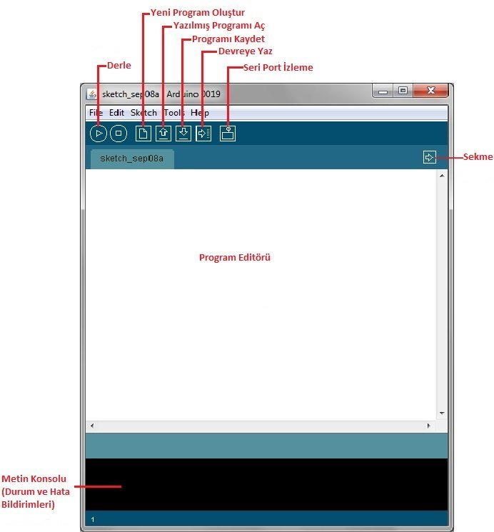 Sizdeki sürüm daha yeni olacağı için pencere biraz farklı olabilir. İlk buton, Compile (Verify) butonu, programı yazdıktan sonra eğer hatalar varsa onları Text Console’da görmemizi sağlıyor.