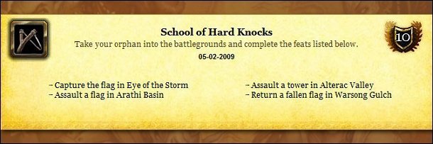 School of Hard Knocks 29 Nisan – 5 Mayıs tarihleri arasında Wow içerisinde de kutlanan Çocuk Haftasına özgü bir başarım. Bu hafta içerisinde dileyen oyuncunun yanına yetim bir çocuk veriliyor. Çocuğun istekleri doğrultusunda, Azeroth dünyasının köşe bucağını gezmeniz gerekebiliyor.