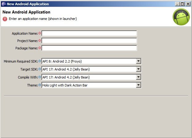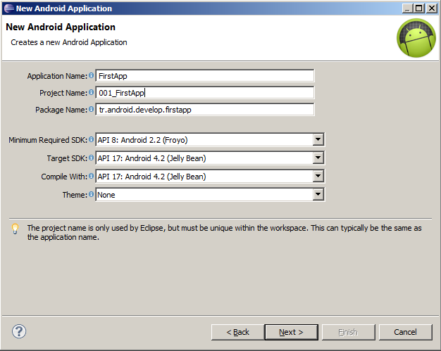 Package Name – Java’dan gelen isimdir. Java’da class’ların prefix isimler için kullanılıyor. Biz tr.android.develop.<programın ismi> gibi bir isim kullanacağız.