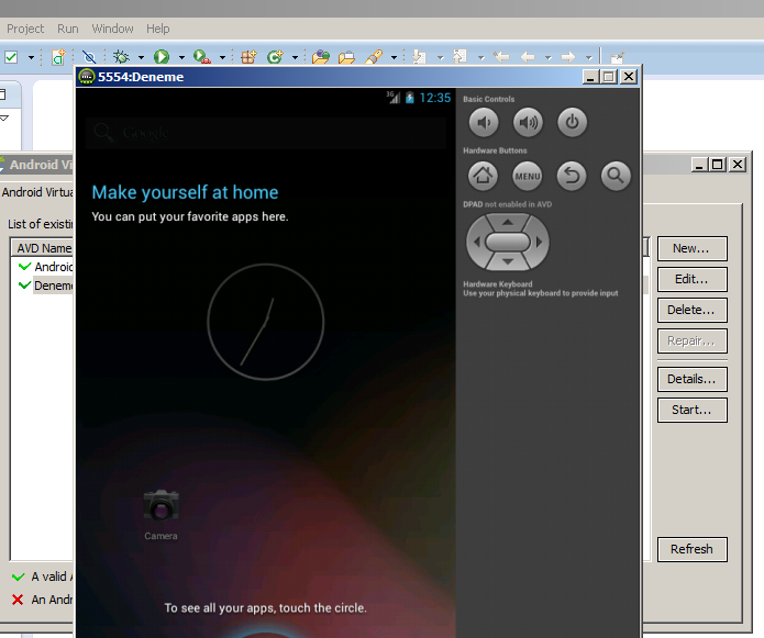 Karşımıza böyle bir pencere gelecektir. Demek ki programımız emulatöre kaydedildi ve düzgün çalışıyor. Eğer bir sıkıntı varsa emülatörü kapatabilir ve yeniden açabilirsiniz. Aynı problem varsa Eclipse’i yeniden çalıştırabilirsiniz. En kötü durumda bilgisayarı yeniden başlatmak zorunda kalabilirsiniz. En önemlisi Ctrl + F11 bastıktan sonra ve emülatör açıldığında bilgisayarda bir şey yapmamak. Türkçe harfleri kullanmasak daha iyi olur çünkü Eclipse programlama ortamı en düzgün İngilizce alfabesiyle çalışıyor.