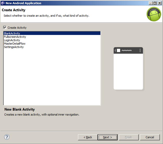 BlankActivity’yi seçiyoruz ve Next butona basıyoruz.