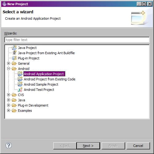 Buradan projenin tipini seçeceğiz – Android > Android Application Project, ve Next’e basacağız