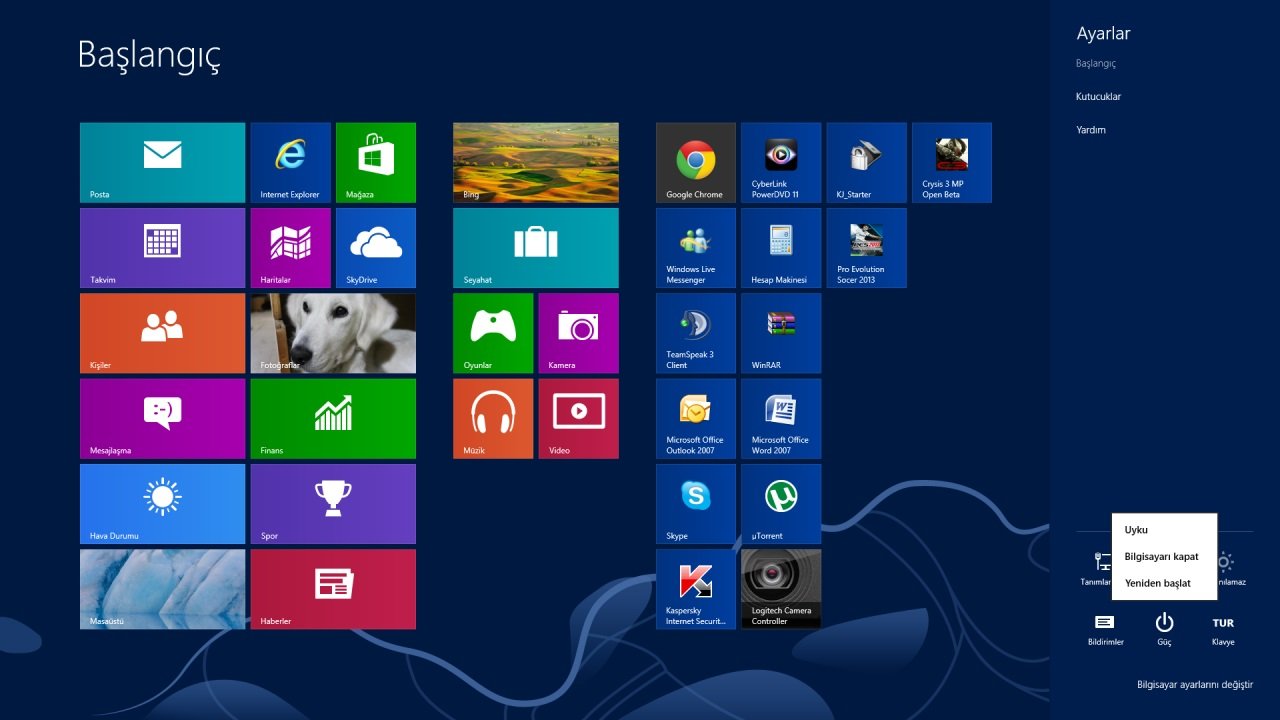 Windows 8’de bilgisayarınızı kapatmak için hızlı araç çubuğundan “Ayarlar”a tıklayın. Gelen ekranda “Güç” seçeneğine tıkladıktan sonra bilgisayarınızı yeniden başlatabileceğiniz, uyku moduna alabileceğiniz ya da tamamen kapatabileceğiniz seçenekler gelecektir.