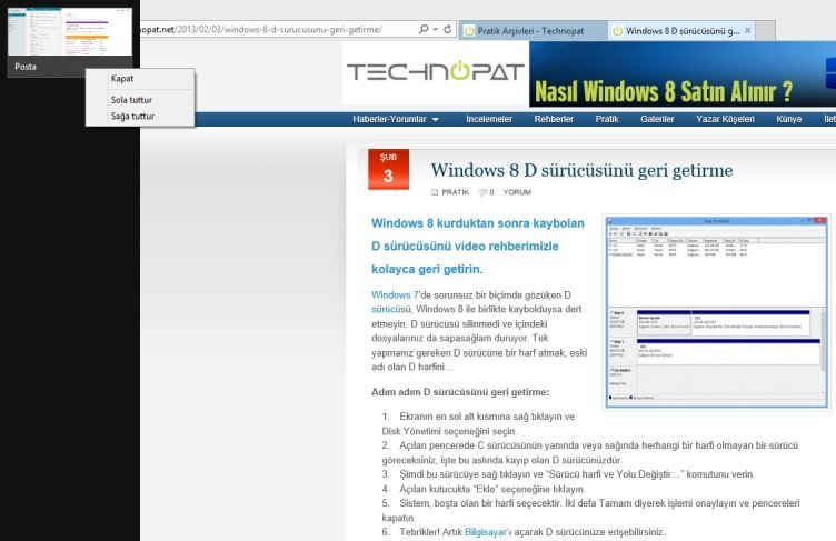 Bu uygulama araç çubuğunda bulunan uygulamalara sağ tıklayıp menü açabilirsiniz. Menüden uygulamayı kapatabilir ya da ekranın soluna ya da sağına hizalayabilirsiniz.