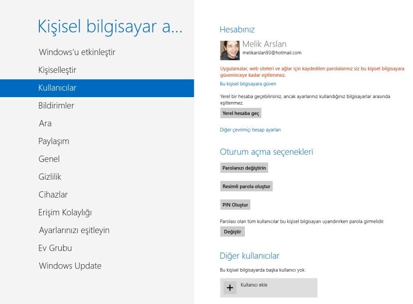 “Bilgisayar Ayarları” ekranında ortalama bir son kullanıcının ihtiyacı olan neredeyse bütün ayarlar bulunuyor. Kullanıcılar, bu ekrandan cihazlara kullanıcı atayabiliyor, yeni kullanıcı ekleyebiliyor, kullanıcıyı düzenleyebiliyor (var olan kullanıcılara Microsoft hesabı tanımlamak ya da kullanıcıların Microsoft hesabını değiştirmek vb.) ya da var olan bir kullanıcıyı silebiliyor, paylaşım seçeneklerini belirleyebiliyor ve Windows arayüzünün bazı kısımlarını kişiselleştirebiliyor (Masaüstü hariç; masaüstünü kişiselleştirme işlemi masaüstünden yapılabiliyor).