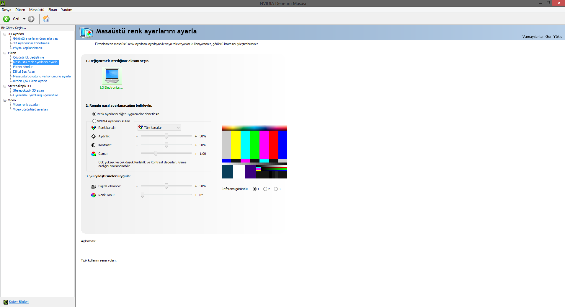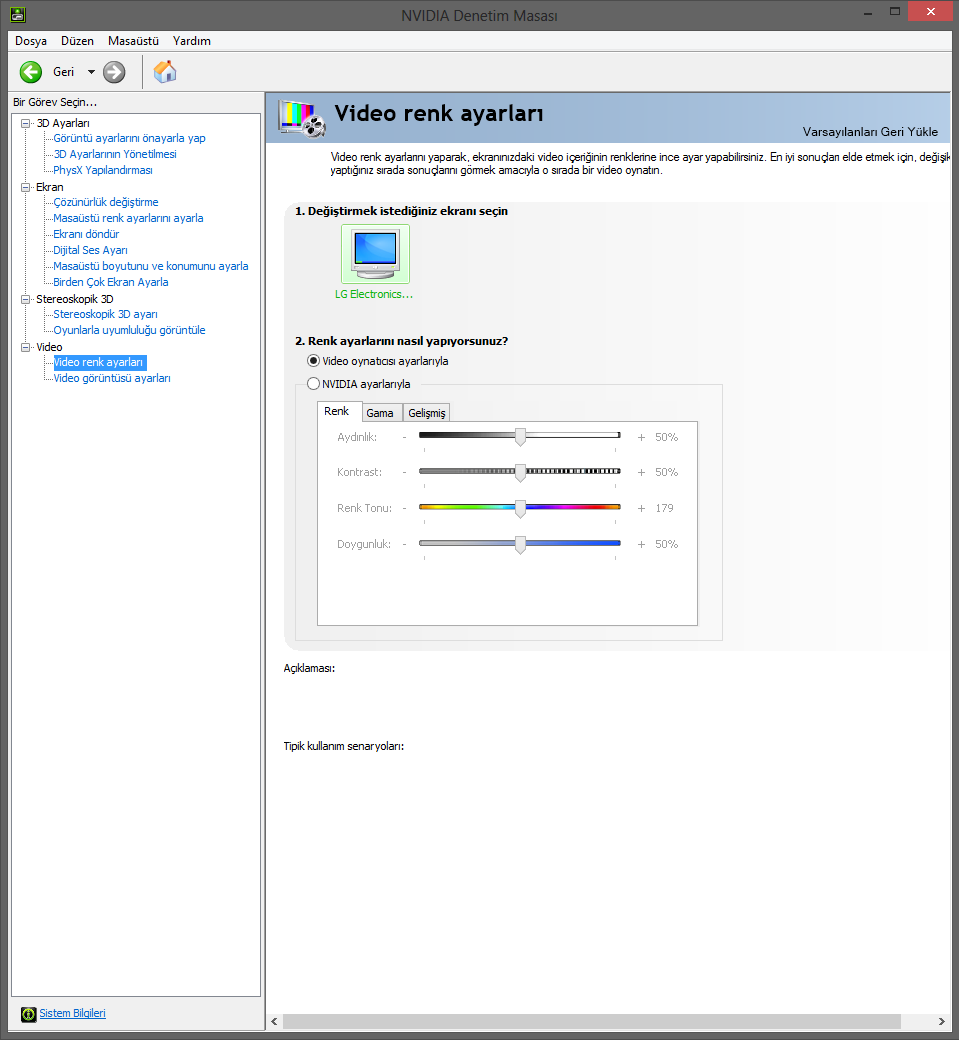 AMD ve Nvidia tarafında video rengi için ince ayar seçenekleri bulunuyor. Nvidia kontrol panelinde video rengi ayarları üç sekmeye ayrılıyor: Renk, Gama ve Gelişmiş.