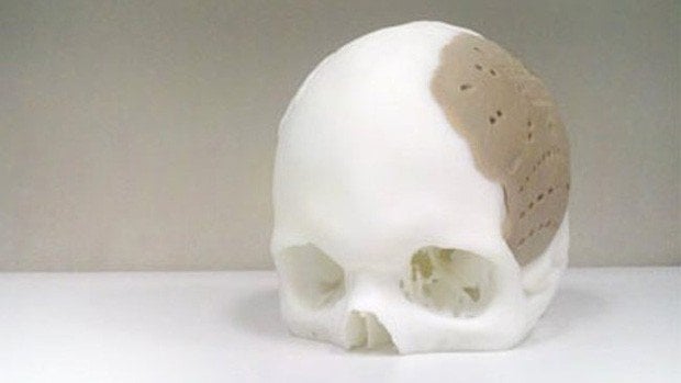 Yukarıdaki resimde gördüğünüz şey gerçek bir kafatası değil tabii ki, sadece CAT taraması sonucu elde edilen veriyle oluşturulmuş bir model. Ancak kafatası modeli üzerinde görülen plastik parça gerçek ve bir hastaya nakledilmek üzere hazırlanmış. Üzerindeki delikler hastanın kendi kemik hücrelerinin tutunup zamanla büyüyerek, plastik malzemenin yerini alması amacıyla bırakılmış.