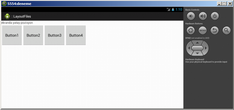Şimdi emülatorde Ctrl+F12 basalım. Ekranın pozisyonu yatay şeklini aldı ve bizim dördüncü butonumuz ekrana sığmıyor.