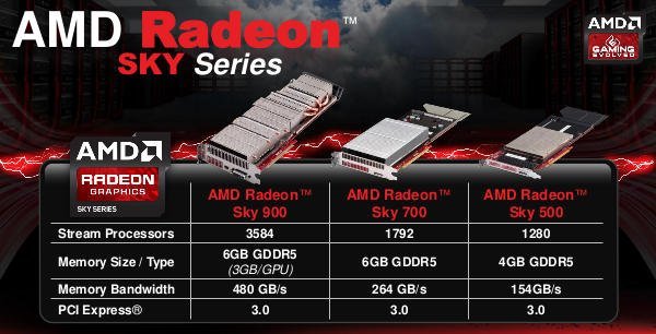 Sky 900, Sky 700 ve Sky 500 olarak adlandırılan bu yeni modeller, gerçekte Nvidia tarafından üretilen GRID serilerine doğrudan rakip olarak tasarlanmışlar. Sky 900 üzerinde çift Tahiti işlemci barındırırken, 700 tek Tahiti işlemciye ve 500 ise tek Pitcairn işlemciye sahip. Kartların donanımsal ve yazılımsal özellikleri de sunucular üzerinden canlı oyun oynanabilmesine imkan tanıyacak şekilde geliştirilmiş. AMD’nin ön plana çıkardığı özelliklerden en önemlisi, kartların hepsinin üzerlerinin pasif soğutucularla kaplı olması. Bu sayede bu serinin sunucuların içinde daha fazla güç çekmeden rahatça ve sessizce soğutulabilmesi amaçlanmış.