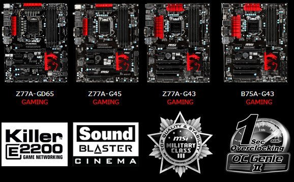 MSI Gaming Serisi anakart modelleri: Z77A-GD65 Gaming , Z77A-G45 Gaming, Z77A-G43 Gaming, B75A-G43 Gaming