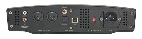 Kasanın arka tarafında ise veri giriş ve çıkış portları sıralanmış. En sağda üç pinli güç kablosu girişi ve onun hemen yanında voltaj seçme anahtarı var. Orta kısımda koaksiyal, USB ve Toslink dijital giriş portları gruplandırılmış. En solda ise analog amfilere çıkış için iki farklı türden (XLR ve RCA) çıkış jakları bulunuyor. Eğer cihazı sırf kulaklıkla kullanacaksanız bir analog amfiye ihtiyacınız olmayacaktır, ancak bir hoparlör sistemi kullanacaksanız o zaman bir de analog amfi edinmeniz gerekecektir.