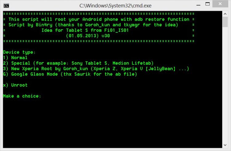 - ICS tabanlı yani eski firmware’ye sahip Sony telefonlar için Normal modu, Sony Tablet S, Medion Lifetab gibi cihazlar için Special modu, Jelly Bean tabanlı yeni firmware’ye sahip Sony telefonlar için (Örneğin Xperia Z, Xperia V) New Xperia Root by Goroh_kun seçeneğini seçin ve talimatları takip edin.