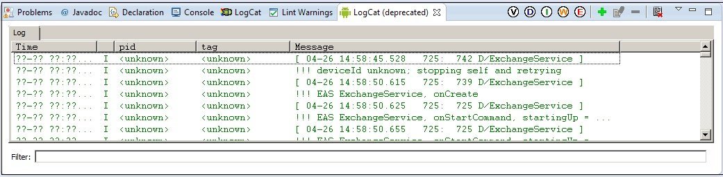 Eğer karşınıza böyle bir yazı geliyor ise demek ki siz yeni emülatorü kullanıyorsunuz. Normal bildirimleri görmek için LogCat sekmeyi seçiniz. DeviceId Unknown ya da deprecated hatalarını böylece anlayabilirsiniz. Çözüm az önce belirttiğimiz gibi LogCat’i kullanmaktır.