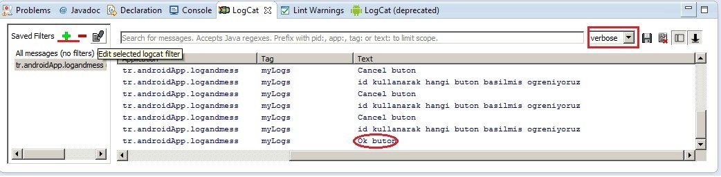 Bu sekmeyi detaylı inceleyelim. Bildirimler (Logs) farklı önem seviyeleri taşıyorlar: ERROR, WARN, INFO, DEBUG, VERBOSE (En önemliden, en önemsize doğru sıralanmış hata listesidir). Menünün üst sağ kısmında göreceğiniz V, D, I, W, ve E sembollerine sahip butonlar bildirimleri filtrelemek için kullanılıyor. Bu butonları denebilirsiniz. Bildirim filtresi sadece kendi seviyesini göstermiyor. Daha da önemli bildirimleri gösteriyor. İleride kendi filtrelerimizi yaratmayı, silmeyi ve düzeltmeyi öğreneceğiz.