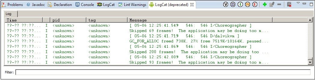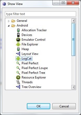 Uygulamanın çalıştığını test ettiğimiz zaman, bildirimleri (Logs) kullanabiliriz. Bildirimleri görmek için LogCat penceresi kullanılıyor. LogCat penceresini görmek için Window > Show View > Other menüsünü açmamız gerekir. Açan pencerede Android > LogCat (deprecated) seçiyoruz.