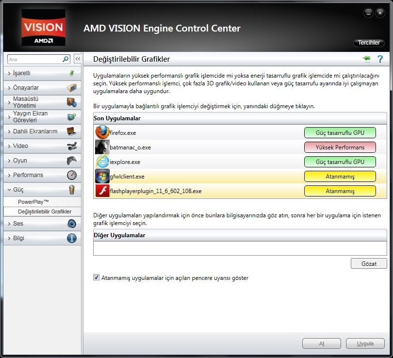 Yine oyunlar açılırken performans ayarını yapabilmek için “Atanmamış uygulamalar için açılan pencere uyarısı göster” seçeneğini seçin. Böylece oyun açılırken hangi grafik işlemci ile açılacağını seçebilirsiniz.