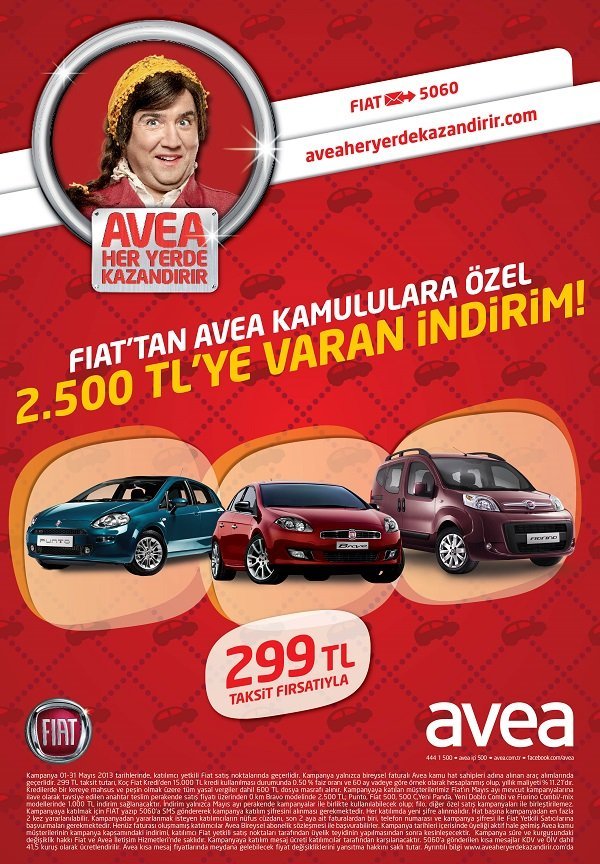 “Avea Her Yerde Kazandırır” platformuyla müşterilerine birbirinden ayrıcalıklı teklifler sunan Avea, şimdi de dünyanın önde gelen otomotiv üreticilerinden Fiat ile gerçekleştirdiği marka işbirliği kapsamında 0 km Fiat araçlarda 2.500TL’ye varan indirim avantajı sunuyor.