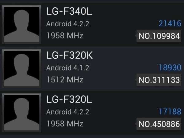 AnTuTu’nun karşılaştırma tablolarında LG Optimus G2’nin 3 farklı modeli ortaya çıktı. F320L ve F340L, Android 4.2.2 işletim sistemine ve 2GHz işlemci gücüne sahip. Demek oluyor ki bu iki model LG’nin amiral telefonları olacak. F320K ise diğerlerinden performans bakımından daha düşük. Android 4.1.2 işletim sistemine sahip F320K’nın 1.5GHz işlemcisi var.