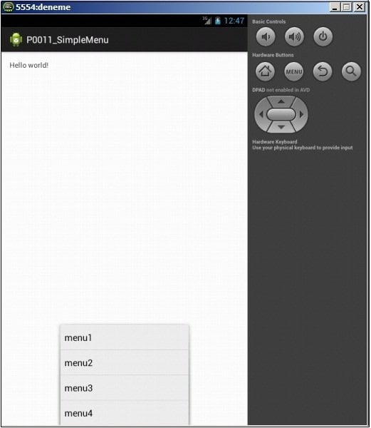 public class MainActivity extends Activity { /** Called when the activity is first created. */ @Override public void onCreate(Bundle savedInstanceState) { super.onCreate(savedInstanceState); setContentView(R.layout.main); } @Override public boolean onCreateOptionsMenu(Menu menu) { // TODO Auto-generated method stub menu.add("menu1"); menu.add("menu2"); menu.add("menu3"); menu.add("menu4"); return super.onCreateOptionsMenu(menu); } @Override public boolean onOptionsItemSelected(MenuItem item) { // TODO Auto-generated method stub Toast.makeText(this, item.getTitle(), Toast.LENGTH_SHORT).show(); return super.onOptionsItemSelected(item); } }