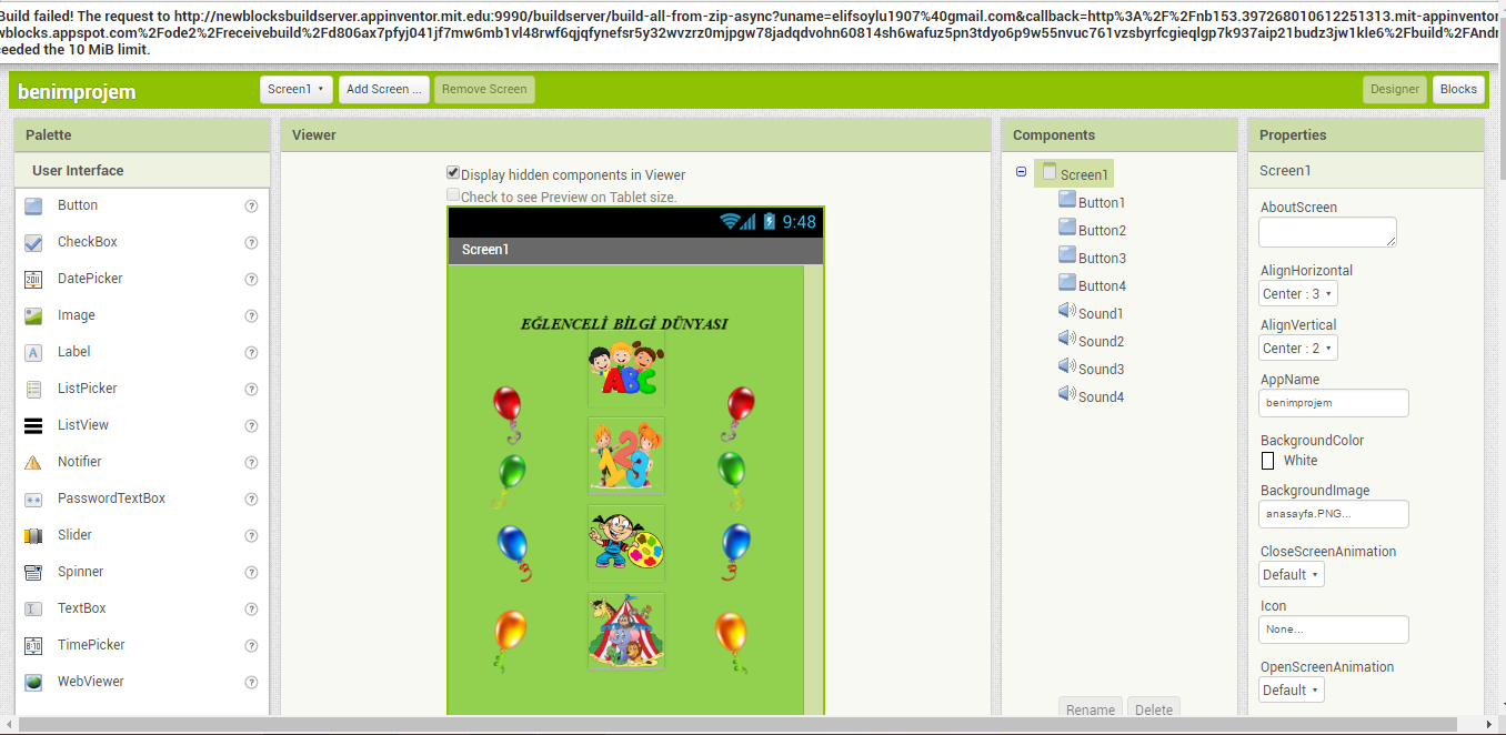 bana yardımcı olabilir misiniz acaba app inventor da oyun hazırladım apk dosyası olarak bilgisayara indirirken böyle bir hata verdi ne yapmam gerekiyor.Lütfen yardımcı olur musunuz ödevimi bitirmem lazım acil.